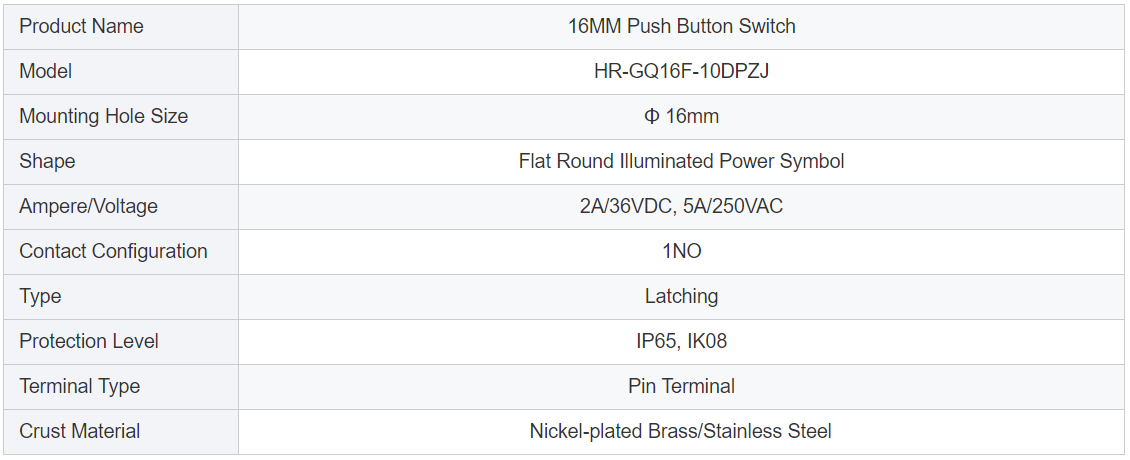 • Product Manual:16MM Flat Round Illuminated Power Symbol Latching IP65 Waterproof Push Button Switch from China